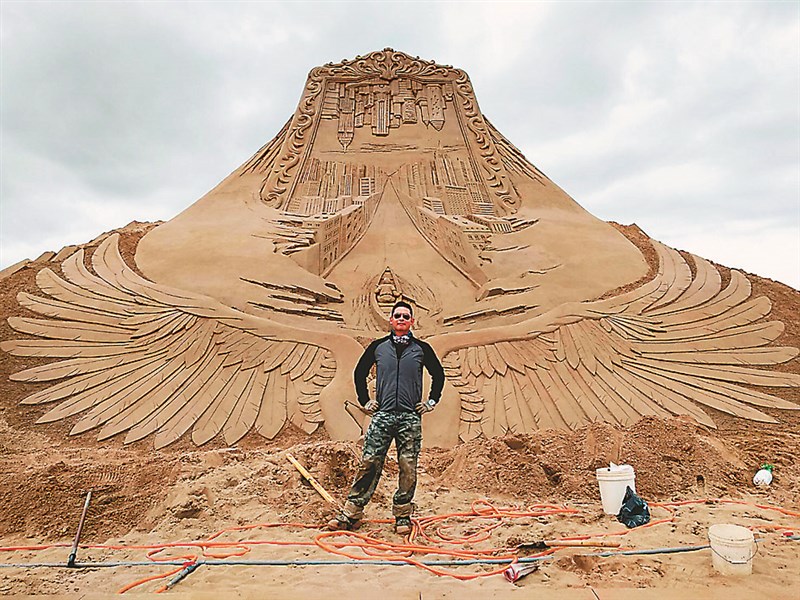「沙子媒材不會影響環境,取之於自然,回歸於大地」。他表示,沙雕靠水跟加壓的瞬間凝結力,過程中會運用怪手將沙倒進板模裡,加入大量的水拌和,再用機器加壓,堆成紮實沙塊,如同金字塔般,一層層往上蓋,「板模會從最上層開始拆,沙雕師就由上至下雕,進行到一個程度就要趕快噴膠,以防突然一個大雨、大風毀壞心血」。