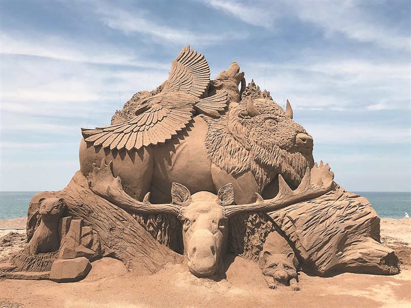 二○一九年周聖強受邀至日本沙雕藝術節創作,主題為北美洲動物,構圖、造型、編排都由他發想。圖/周聖強提供