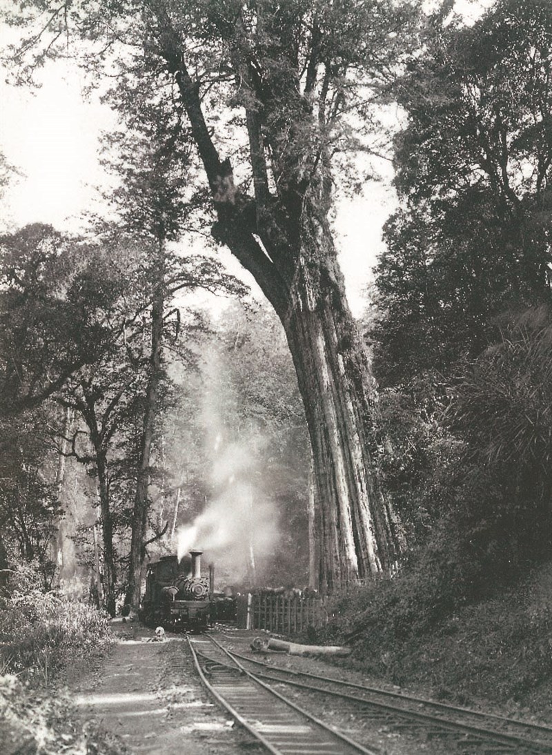 阿里山鐵道開通後,蒸汽小火車經過阿里山神木的畫面。圖/劉明財提供