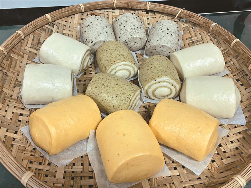 專案經理梁秀琴說,清水岩生態園區推動環境教育,在園內使用自製堆肥,以無毒草生方式栽種野菜,最近推出新研發的野菜饅頭,將角菜、紅綠地瓜葉、皇宮菜、鬼針草,抗氧化強的香椿、防疫聖草紫蘇、芙蓉、艾草等植物,作為材料,南瓜饅頭則是以新鮮南瓜打成泥加上老麵發酵製成。