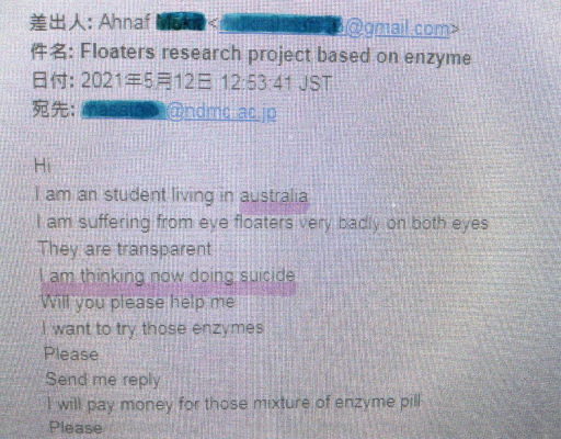 因飛蚊症憂鬱到想輕生 台日聯手救援澳洲工程師 |2021.08.16 語音朗讀 895觀看次 字級 大 中 小 圖/unsplash 【本報綜合訊】住澳洲東海岸的28歲工程師阿納夫Ahnaf,5年來飽受飛蚊症困擾到想輕生,後來在網路上看到日本防衛醫科大學與台灣合作研發的口服綜合水果蛋白酶能增強人體吸收眼睛玻璃體混濁機能,抱一絲希望寫信求助,信件轉至台灣參與研究的輔英科大附醫眼科醫師洪啟庭手中,洪展開跨海協助,解決這名工程師的眼疾困擾,重新恢復正常生活。日本防衛醫科大學轉給眼科醫師洪啟庭的救助信,來信者是為飛蚊症所苦的澳洲籍年輕工程師Ahnaf。圖/洪啟庭醫師提供洪啟庭是於今年5月間接獲日本防衛醫科大學轉來的電子郵件,來信者是澳洲籍年輕工程師Ahnaf,自述雙眼近視250度,5年前出現飛蚊症,常見長條帶些透明的浮游物在眼前漂浮,嚴重影響工作及生活。洪啟庭表示,Ahnaf寫信的前一個月因飛蚊頻率大增,憂鬱到精神科就醫甚至想輕生,後來在網路上看到台日合作研發的口服綜合水果蛋白酶,寫信向日本防衛醫科大學求助,日方把信交給參與研究的他,他隨即聯繫外交部亞太司與澳洲駐台辦事處人員透過管道將口服綜合水果蛋白酶交到Ahnaf手上,Ahnaf約2個月後生活恢復正常,情緒也好轉。澳洲求助者右眼的玻璃體混濁情況,後來獲得改善。圖/洪啟庭醫師提供洪表示,飛蚊症是因眼睛玻璃體隨年齡退化、眼部外傷、紫外線曝曬或PM2.5侵襲,造成眼睛玻璃體主要成分玻尿酸分解與眾多種類膠原纖維蛋白破壞,產生玻璃體液化與混濁及各種蛋白的雜亂排列,光線進入眼睛時,玻璃體混濁的部分會遮擋光線使影像成為陰影。由於目前尚無明確的治療方法,醫界通採觀察追蹤方式,據統計,約11%患者在1個月至5年後症狀會自行消失,64%視力降低,14%可能會視網膜剝離失明。2015年起,洪啟庭與仁科大學製藥研究所長謝博、日本防衛醫科大學眼科教授竹內大、東京醫科大學眼科醫局長竹內禮等人組成團隊研究口服綜合水果蛋白酶,水果蛋白酶萃取自鳳梨、木瓜與無花果蛋白酶小腸中吸收,協助增強人體吸收眼睛玻璃體混濁機能,經完成人體實驗後,成果刊登於於去年的瑞士醫學期刊「應用科學」。 前一篇文章 網球/費德勒膝蓋三度動刀 職業生涯恐告終 下一篇文章 塔利班:戰爭已結束 將建立阿富汗伊斯蘭酋長國 熱門新聞 01WTA、ATP年終賽 獎金創新高2025.11.0702健保補充保費變革 政院急踩煞車2025.11.0703再闖WTA年終賽 謝淑薇力拚第2冠2025.11.0704補充纖維、鈣、鎂、鉀 預防多種疾病風險2025.11.1105【寬鼎畫語】 看不見的真相2025.11.1006【詩】再現綠川2025.11.0707佛光山大學校長論壇 盼教育融入佛法2025.11.0808【樹博士系列】土壤的祕密XV 水稻田減排新觀念IV 土地的溫柔革命 雲林大埤寫益生菌奇蹟2025.11.0909佛光山深耕紐西蘭 毛利族傳統禮致謝2025.11.0710星雲大師全集【傳記】百年佛緣─生活篇 我的衣食住行 5-52025.11.07 訂閱電子報 台北市 天氣預報 台灣一週天氣預報 相關報導 通霄電廠閃鳳凰 大煙囪「放倒」台近7成員工薪資 低於平均訪歐返台 蕭美琴:處境艱難不退縮魏哲家:黃仁勳來要更多晶片興達電廠 應變演練澎湖馬祖包機 空中交通創舉