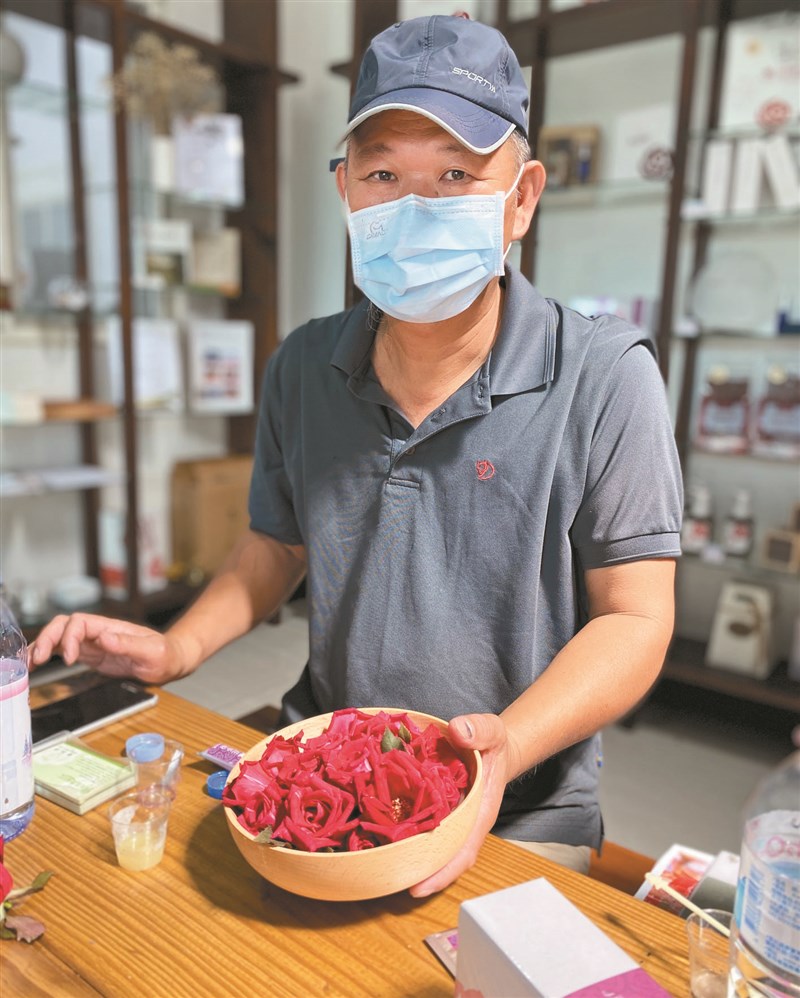 大花農場主人楊添得,在花卉領域鑽研十四年,研發十三種與玫瑰花相關的產品。 圖/劉星君