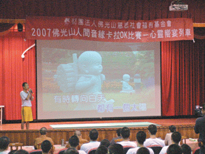 二○○七年由佛光山慈悲基金會監獄教化組滿度法師,著手策畫在各監所推動、舉辦「人間音緣歌唱比賽」,鼓勵受刑人傳唱由星雲大師作詞、文辭涵義深遠、音韻和諧暢達的人間音緣歌曲。活動反應熱烈與效益顯見,始料未及,連現場的評審老師與義工,都動容落淚。原來「感動」是每個人內心深處,「無言」的共通語言!慈悲基金會/文‧圖
