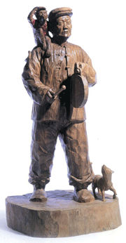「王樂仔仙」,作品以寫實技法,雕刻早期農業社會廟口前賣藝走江湖的人情題材。戴著圓扁帽、穿著兩排開襟扣衣裳、精神爍爍的王樂仔仙,肩上坐著一隻睜大雙眼,眺望前方的戴帽小猴,腳旁則有抬頭仰望的小狗,牠們盡忠職守依靠著主人,為鄉間百姓帶來快樂時光。