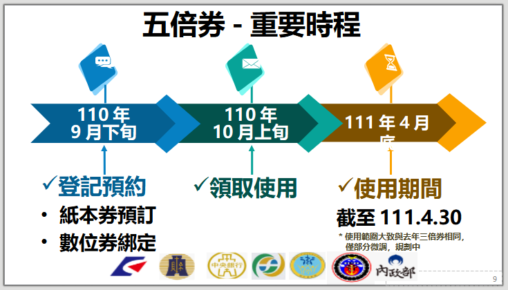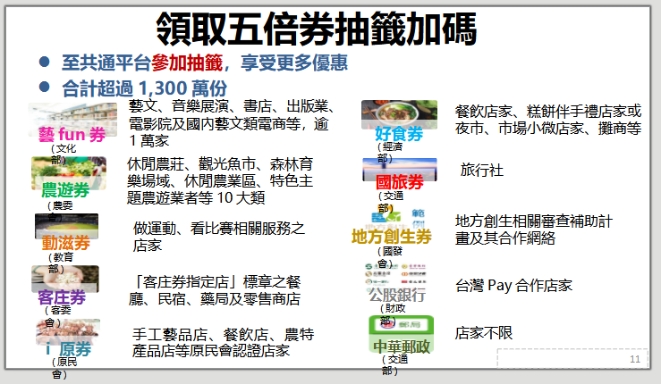 五倍券出爐!擬10月初領取 可用至明年4月 |2021.08.26 語音朗讀 3781觀看次 字級 大 中 小 行政院今正式對外公布五倍券規劃,預計於10月初上路,使用至明年4月30日截止。同時也比照去年三倍券,納入動滋券、藝fun券、農遊券等方案。圖/行政院提供 【本報台北訊】行政院力推振興五倍券,今正式對外公布正式規劃,預計於10月初上路。國發會指出,將於9月下旬開放預約登記,包括紙本券預定,和數位券綁定,並於10月上旬領取使用,使用於明年4月30日截止。同時也比照去年三倍券,納入動滋券、藝fun券、農遊券等方案。五倍券預計10月初上路,分紙本券和數位券,現規劃紙本券一套10張共5000元,內含3張1000元、2張500元、5張200元,將交由中央印製廠印製,有國幣防偽等級;而選擇數位五倍券的民眾則可綁定信用卡、電子支付、悠遊卡或一卡通等電子票證。行政院今正式對外公布五倍券規劃,預計於10月初上路,使用至明年4月30日截止。同時也比照去年三倍券,納入動滋券、藝fun券、農遊券等方案。圖/行政院提供五倍券現規劃紙本券與數位券,紙本除可在郵局實體換取,並規劃全國1萬1千家超商可預約換取;數位部分,將可綁定信用卡、電子支付、悠遊卡或一卡通等電子票證。而五倍券在全國實體店家、攤商皆可使用,並適用特定電商,不過繳納水費、電費、罰金、勞保費、健保費、國民年金保險費,皆不在適用範圍。行政院今正式對外公布五倍券規劃,預計於10月初上路,使用至明年4月30日截止。同時也比照去年三倍券,納入動滋券、藝fun券、農遊券等方案。圖/行政院提供 前一篇文章 MLB/大谷單場挨3轟 金鶯逆轉中止19連敗 下一篇文章 明年分科測驗 各科調整為60級分 熱門新聞 01【詩】 鐮刀俠2026.04.2102佛光山開山60周年 傳授三壇大戒2026.04.2003氣候變遷 牽動美年輕人生育觀2026.04.19042026地球日 行動永續綠色未來 2026.04.2205永和學舍慶佛誕 千人浴佛清淨身心2026.04.2206人情冷暖與計算 悅讀〈 杜十娘怒沉百寶箱 〉2026.04.2107火金姑復育有成 螢光爆發2026.04.2108社論--世界民主大倒退2026.04.1909嘉義.朴子 樸城煙霞古韻長 水道遺風話滄桑2026.04.2010野生動物夜未眠2026.04.19 訂閱電子報 台北市 天氣預報 台灣一週天氣預報 相關報導 美太空人林琪兒 重返兒時舊居地第18屆兩湖論壇 南投登場總統訪史瓦帝尼 臨時喊卡陸惠台措施 商總:利民就該開放台灣引領轉型AI Google肯定天龍演習 揭密機艙