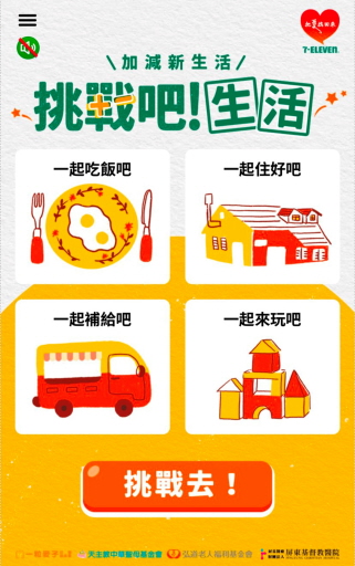 台灣將於2025年邁入超高齡社會,打造友善高齡環境刻不容緩, 7-ELEVEN攜手一粒麥子基金會、中華聖母基金會、弘道老人福利基金會與屏東基督教醫院等社福團體,推動「加減新生活-銀齡新生活」公益募款行動,也設計能帶來成就感同時認識高齡者的網頁遊戲。