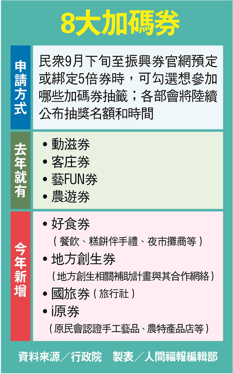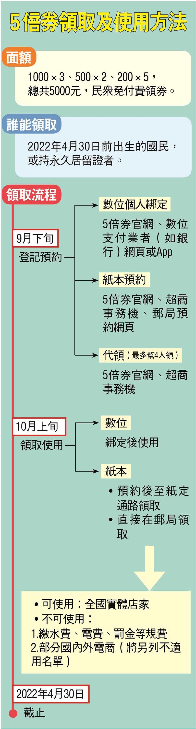 5 倍券 10 月發 8 大券加碼抽 |2021.08.27 語音朗讀 1338觀看次 字級 大 中 小 8大加碼券國內許多攤商快撐不下去,中央昨公布5倍券發放細節,有助於恢復台灣經濟。圖/許正宏5 倍券領取及使用方法 【本報台北訊】行政院昨拍板振興5倍券規畫方向,最快將於10月初正式上路,凡在2022年4月30前出生的中華民國國民皆可直接領券;行政院也比照去年,推出藝FUN券、好食券、國旅券等8種加碼券抽籤,總共1300萬份。國發會主委龔明鑫表示,預估經濟效益可比去年3倍券多出一倍以上,達2000億元。國發會昨於行政院會報告「振興5倍券規畫方向」。行政院長蘇貞昌指出,由於新冠病毒疫情,導致小攤商、小商家、夜市、百貨等內需市場受到很大衝擊,因此在防疫成功之下,政府用最大的誠意、努力及經費預算推出5倍券,民眾不用付1000元,就可領取5倍券。10月能領券 全國攤商可使用 國發會指出,將於9月下旬開放民眾預約領券,可以預定紙本券或綁定數位券,並於10月上旬領取紙本券,使用期限至明年4月30日。龔明鑫表示,凡於明年4月30日使用期限前出生的中華民國國民皆可領取;另外,已取得我國永久居留身分的外籍人士亦可領券。目前,紙本券規畫一套10張,包括3張1000元、2張500元、5張200元。除可在郵局實體換取,並規畫全國1萬1000家超商可預約換取;數位部分,將可綁定信用卡、電子支付、悠遊卡或一卡通等電子票證。而5倍券在全國實體店家、攤商皆可使用,並適用特定電商,不過繳納水費、電費、罰金、勞保費、健保費、國民年金保險費,皆不在適用範圍。國發會指出,未來將建立一個5倍券的官網,它與數位支付相關業者的App互通,兩者皆可用來綁定數位券;若要領紙本券,則可利用超商服務機,以健保卡預約,或可用中華郵政預約網頁,以身分證字號和手機號碼做預約。龔明鑫表示,為避免民眾排隊領取5倍券,造成群聚,此次發放主推預約制,但行政院說明,為鼓勵民眾透過預約制換領5倍券,擬在預約制度實施一段時間後,再開放民眾至郵局直接換領,具體時間尚在研議中。各部會加碼券 1.3萬份供抽籤另外,去年各部會針對3倍券共推出4種加碼券,今年則合計推出8種加碼券、共1300萬份供抽籤,包含去年就推出的動滋券、客庄券、藝FUN券、農遊券,以及今年新增的好食券、地方創生券、國旅券、i原券;有別於去年民眾必須到各平台登記,今年將採單一平台登記。行政院政務委員唐鳳表示,民眾至官網預定或綁定5倍券後,可登記想要的加碼券,各部會後續將公布抽獎名額和時間。地方拚振興經濟 再推加倍券中央昨公布5倍券發放細節,地方也陸續加碼。新北市長侯友宜喊出「新北加倍券」,將提供20萬份「500換1000」、10萬份「1000換2000」與1萬份「5000換10000」。高市府擬推出1000元的高雄券,每張面額為50元,盼便於在攤商夜市中流通。侯友宜指出,新北加倍券包含「加倍送、加好用、加便利」,除金額可以加倍換外,面額最小是50元,對於要去菜市場買菜的民眾,還可以不用找零;而使用範圍涵蓋各種庶民經濟如市場、夜市、旅館、商圈、觀光工廠等。新北市府說,未來兌換方式、加倍券樣式、具體能使用的地方與抽獎等,都會在9月中一併公布。北市府則表示,加碼方法是利用一卡(悠遊卡)、一通(台北通)和一付(悠遊付),消費後回饋到帳戶中,不會有實體券,一定會針對市場和商圈振興,不分對象,只要在台北市消費就能享優惠,至於要加碼多少、花費多少預算,要等確定後才會對外公布。 前一篇文章 清零有望 未來2周是關鍵 睽違108天+0 下一篇文章 終結疫情有2障礙 新冠病毒清零? 人類史上只戰勝天花 熱門新聞 01微細氣泡 用途也很多2026.01.2002小氣泡能量大2026.01.2003贈春聯、福袋 新加坡佛光山送福到社區2026.01.2004學測落點預估 台大醫59級分2026.01.2005【古德傳法】永明延壽與衢州天寧禪寺2026.01.2106星雲大師全集【傳記】百年佛緣─社緣篇 黃金不動道人心─談我不為金錢誘惑的想法 4 - 12026.01.2007友善失智 上錯菜卻贏得客人心2026.01.2008聯合國示警 全球水資源破產2026.01.2209【寺院走讀】奉恩寺的風, 吹過唐代的霜2026.01.2010【王文靜看世界】 「家庭主婦」凱薩琳 把美國總統逼下台2026.01.21 訂閱電子報 台北市 天氣預報 台灣一週天氣預報 相關報導 吃素好體力 霍諾德登頂101 美新國防戰略未提台灣 抗中非優先任務印度減廢 塑膠垃圾抵學費 澤倫斯基瑞士演說 控俄飛彈含台灣零件 2026天文奇景 日全食、6星連珠 讓出面罩 勇消詹能傑捨命救人
