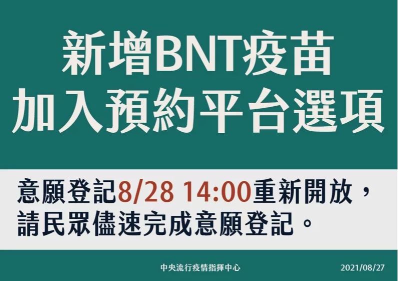 【本報台北訊】首批BNT疫苗約有195萬劑將在兩周內到貨,中央流行疫情指揮中心今(27)日宣布,疫苗意願登記平台新增「BNT疫苗」選項,指揮官陳時中表示,新增BNT疫苗為選項,平台將開放明(28)日下午2時重新開放,民眾如果有意願請盡速上網登記。