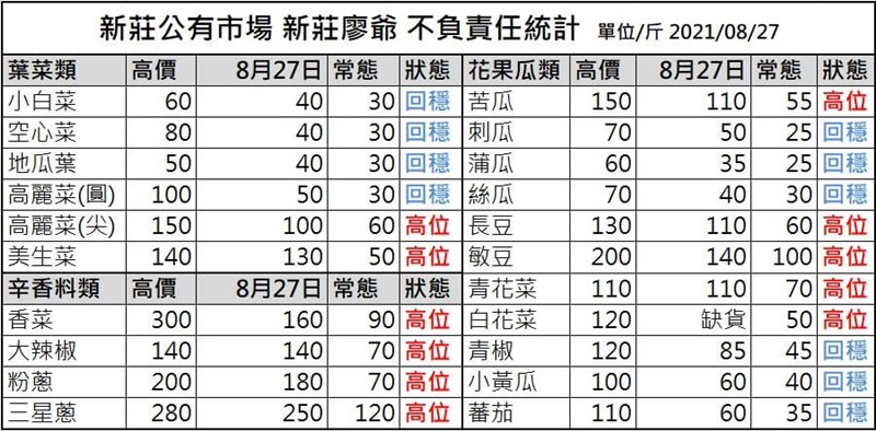 荷包鬆口氣! 天氣回穩菜價跟著降價 |2021.08.27 語音朗讀 1775觀看次 字級 大 中 小 圖/新莊公有市場擔任賣菜郎廖炯程臉書 【記者楊旻芳台北報導】最近到市場買菜應該荷包消風的很有感,因為日前南部蔬菜產地因豪雨成災,造成菜價屢創歷史新高,新莊公有市場擔任賣菜郎廖炯程分享近日番茄價格上漲至一斤100元、美生菜一斤120元、青花菜一斤也要120元,最新消息是菜價漸趨穩定,未來只要天氣持續穩定,菜價還會往下降。美生菜一斤飆漲至120元。圖/廖炯程臉書廖炯程說,因日前中南部大雨淹大水,蔬菜產地無菜可收,不少瓜果、葉菜都泡湯,菜價跟著上漲,至少有5分之1的蔬菜類別,每斤一度飆破百元大關,供需失衡的狀況下,菜價屢創歷史新高。他說,每天的菜價取決於台北農產每日的拍賣價格,像先前A菜平常落在一斤30-40元,後來漲到一斤80元,今天來到65元,雖然要回到之前的價格還有一段距離,最重要的是還是要看天吃飯,若天氣穩定就會持續降價。另外,進口蔬菜也有漲價,像是花椰菜、美生菜都是進口,大家都在搶貨運,造成海運漲價連帶菜價也上漲。而進口這些蔬菜是要平衡供需穩定菜市場物價。廖炯程提供的菜價表。圖/廖炯程新冠疫情對於傳統市場的影響廖炯程表示,疫情一開始爆發時,尤其在5、6月傳統市場首當其衝,消費者不敢進市場採購,零售顧客只剩下10分之1,有些顧客就算走到市場也不敢進去,直接打電話或傳訊息訂購,再由攤商送至市場口面交。他指出,原本傳統市場沒在做外送服務,因為疫情也慢慢轉型,開始往外送來服務顧客,直接將熟識顧客的菜送至指定的地點。疫情期間轉型提供蔬菜箱外送服務。圖/廖炯程臉書他說,不過這個狀況在兩個禮拜前出現轉折,因為年長者打完疫苗開始外出,一周開始會有兩次的採購行為。現在還有另一個隱憂,因為菜價貴消費者開始貨比三家,猶豫期變長,會希望繞遍市場找CP值較高的蔬菜,讓市場攤商非常憂慮,深怕出現破口。圖/廖炯程臉書 前一篇文章 日職/宋家豪暫代終結者 生涯首度救援成功 下一篇文章 PLG/新北國王第一波視覺釋出「榮耀黃」照耀新北市 熱門新聞 01台南.佳里 蕭壠香火溯根源 紅磚古厝映流年2026.04.2702久坐看電視易失智 閱讀談話活化大腦2026.04.2803【人間行者心】日常即是佛法2026.04.2604台灣佛教總會理事長交接 佛光山祝賀2026.04.2705【看人間】縮小自己 是與朋友相處的祕訣2026.04.2806好萊塢剩食 化弱勢救命餐2026.04.2607程如晞 用敬老卡開心探索生活2026.04.2508【生活智人162】美國媒體人范德海 分享五心法 助你掌控人生2026.04.2509追思緬懷星雲大師 大馬佛青獻唱佛曲2026.04.2910印度音樂公車 填補貧童教育2026.04.28 訂閱電子報 台北市 天氣預報 台灣一週天氣預報 相關報導 宜蘭三星農地重劃 完善農業區新北藍白整合 李四川勝出游盈隆就職 誓打造公正客觀中選會台61南延高雄拍板 安平港2路線送評估林佳龍任總統特使 抵史瓦帝尼看電影、聽演唱會 免課娛樂稅