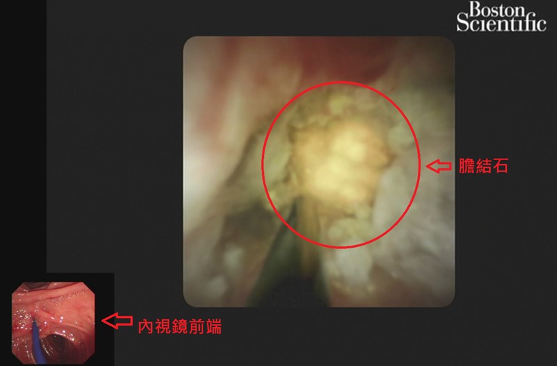 電震碎石術使用不到一毫米的探頭,進入膽胰管內視鏡,醫師可直視、針對結石狀況,利用電擊爆破所產生的「水波」進行脈衝碎石,將碎石移出膽管。圖╱台北榮總