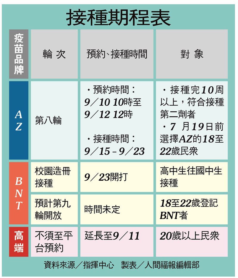 此外,年滿20歲的民眾可直接到醫療院所接種高端疫苗,原規畫免預約制僅到9月6日,考量高端疫苗仍有充裕,免預約制延長至11日。