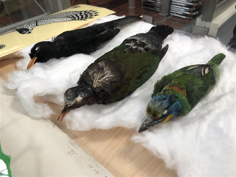 台灣猛禽研究會帶著3隻遭窗殺的鳥類標本,解說窗殺原因與減少窗殺的方法。圖╱鍾維軒