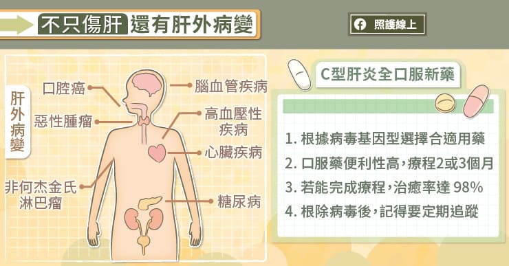 C肝拖延不治療 染新冠死亡風險增3.3倍 |2021.09.08 語音朗讀 706觀看次 字級 大 中 小 研究顯示,C肝患者拖延不治療,感染新冠病毒死亡風險增加,是非肝硬化者的3.3倍!示意圖/unsplash 【本報台北訊】C型肝炎肝硬化患者,若染新冠病毒,死亡風險是非肝硬化者的3.3倍!台灣肝病醫療策進會會長,暨國立臺灣大學醫學院附設醫院副院長高嘉宏教授說:C型肝炎肝硬化患者感染新冠後,會發生全身性發炎反應,甚至導致「細胞激素風暴」,破壞包含肝臟在內的全身器官。有鑑於肝硬化患者正常的肝細胞比正常人少很多,只要有一點損害就可能使肝功能惡化,進展成器官衰竭,增加重症及增加死亡風險。高嘉宏教授說,世界上每30秒就有一人因肝炎死亡,C型肝炎治療刻不容緩。但因為疫情影響,民眾進行肝炎篩檢、治療C型肝炎積極度銳減,根據全球性大型研究指出,若因疫情拖延治療,C肝患者病程惡化與死亡人口可能增加。我國有高達12萬名還沒有治療C型肝炎的患者,暴露於肝病三部曲(肝炎→肝硬化→肝癌)、肝外病變與感染新冠死亡風險提升的危機中。高嘉宏教授說,為了幫助國人快速擺脫C型肝炎糾纏,政府特編預算,給付高安全性、高療效的C型肝炎全口服新藥。不僅治癒率高達98%且副作用輕微,治療更僅需要2個月或3個月,領藥最少只需要3次。疫情期間,其短療程特性更可幫助減輕患者回診的焦慮感,治療也不影響疫苗施打。高嘉宏教授鼓勵:「45歲至79歲的國人(原住民族群為40至79歲),應趁疫情趨緩之際,把握一生一次免費肝炎篩檢機會,確認自己是否感染C型肝炎。若確認也無須擔心,今日已有多元且有效的全口服新藥可幫助患者快速治癒C型肝炎。」C肝治療不能等!感染C型肝炎後,患者可能出現疲倦、噁心、食欲不振、腹部不適等症狀,但也可能沒有明顯症狀,很容易遭到忽視。麻煩的是,C型肝炎會導致肝臟慢性發炎,持續反覆發炎更會導致肝臟纖維化,漸漸演變成肝硬化,肝臟功能愈來愈差。肝硬化患者可能出現黃疸、腹水、凝血功能變差,嚴重時還可能造成意識改變、中樞神經障礙的「肝腦病變」。長期處於慢性肝炎的狀態下,還會增加罹患肝癌的風險,加速「肝炎→肝硬化→肝癌」(肝病三部曲)病程惡化。高嘉宏教授解釋,「C型肝炎病毒會持續破壞肝臟,一旦進入肝硬化,每一年約有3%-5%患者會產生肝癌。如果不能早期診斷,早期治療的話,患者的存活或生活品質都會受到很大的影響。」B型肝炎、C型肝炎患者除了積極治療,也務必定期追蹤,每3至6個月應做腹部超音波檢查,才能及早發現肝腫瘤。因為COVID-19新冠疫情的關係,部分患者追蹤的間隔可能會拉長,高嘉宏教授提醒,肝炎檢查切莫拖延超過3至6個月,以免在這段期間裡,小顆肝癌長出來而不自知。C型肝炎病毒除了會傷害肝臟之外,還可能導致多種肝外病變(extra-hepatic disease),高嘉宏教授分析,C型肝炎病毒會造成身體慢性發炎、脂質代謝異常、胰島素阻抗,增加多種疾病發生的機會,包括中風、冠狀動脈疾病、糖尿病、腎臟病、認知障礙等,次外罹患癌症的風險也會上升,例如:口腔癌、非何杰金氏淋巴瘤等。面對疫情,C肝患者掌握健康關鍵分析「除了由國民健康署免費肝炎檢測機會,如臺大醫院在內的許多醫院,也都響應政策,在院內執行召回計畫。把醫院裡面曾經檢驗到C型肝炎抗體陽性的患者名單列出來,由肝炎個案管理師聯繫把患者找回來,到胃腸肝膽科接受治療。」高嘉宏教授說,「鼓勵患者若接到相關篩檢或召回電話,應積極配合篩檢及回診治療!」高嘉宏教授說,近年來C型肝炎治療以全口服新藥為主,療程大約2個月或3個月,若能完成整個療程,治癒率可達98%。因為是口服藥,患者服藥也相當便利。對於新冠疫苗施打也不會造成影響,已經登記疫苗施打的民眾,不須擔心療程會延誤疫苗施打時間。高嘉宏教授提醒,接受C型肝炎治療的過程中,千萬不要因為疫情就任意停藥,若隨意停藥不僅會使治療成功率降低、甚至失敗,還會可能衍生許多治療問題。高嘉宏教授也叮嚀,根除C型肝炎病毒後,記得定期追蹤。因為清除病毒後,肝硬化依舊存在,患者還是需要定期回醫院接受腹部超音波檢查、胎兒蛋白等肝癌篩檢。日常生活中,請勿與人共用牙刷、刮鬍刀、指甲剪等可能沾到血液的器具,要避免飲酒,並維持健康生活型態,包括規律運動、充足睡眠、攝取均衡營養等。透過積極治療及日常生活管理,才能雙管齊下擺脫「肝」苦人生。本文由「照護線上https://www.careonline.com.tw/」授權轉載。原文出處:https://www.careonline.com.tw/2021/08/hepatitis-c.html原文標題:C肝不治染新冠死亡風險增加,切莫拖延篩檢及治療!肝炎專家圖文解析 前一篇文章 染疫後施打兩劑疫苗 保護性抗體達100倍 下一篇文章 夏秋換季頭皮癢 中醫師:「乾溼平衡」養護之道 熱門新聞 01水晶物理性 與化學性質2026.03.1702新竹.尖石 群峰疊翠山色佳 泰雅歌聲伴霧霞2026.03.1603澎湖食農教育 向下扎根2026.03.1904越南大選 料共產黨壓倒性掌控2026.03.1605店貓上班摸魚睡翻 萌樣逗樂網友2026.03.1806飛天白馬秀 燈會大亮點2026.03.1507大馬急轉彎 撤回美對等貿易協議無效說 2026.03.1808北美最乾燥加州死谷 罕見繁花錦簇2026.03.1809美海軍引進機器人 爬牆維修艦艇2026.03.1910【分享時刻】某些愛2026.03.18 訂閱電子報 台北市 天氣預報 台灣一週天氣預報 相關報導 落實勤洗手 腸病毒不來找春分養生重調