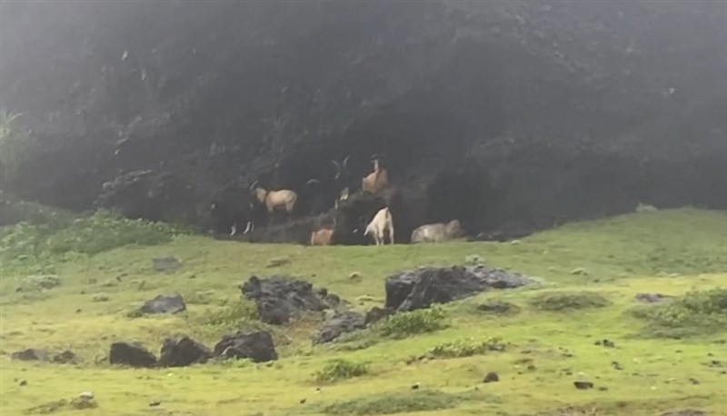 蘭嶼風雨逐漸增強,四處趴趴走的羊群,躲在礁岩縫裡避風雨。圖/讀者提供