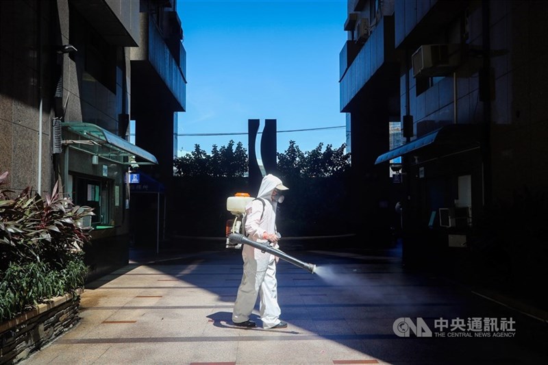 新北幼兒園群聚案延燒,「埃及爸」遭質疑為感染源。感染科醫師認為「埃及爸」無法排除被小孩傳染的可能性。圖為環保局清潔人員穿防護衣進行噴灑消毒,防堵疫情擴散。圖/中央社檔案照片