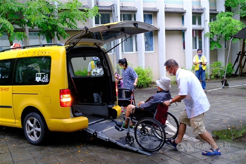衛福部預告,長照給付及支付標準將入法,約7萬名都會區輕度失能者也適用交通接送服務,新制最快今年底上路。圖為高雄市「熱血計程車」載送長者打疫苗。圖/中央社檔案照片