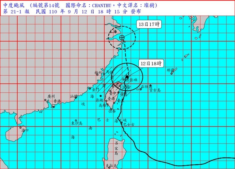 氣象局指出,目前璨樹離台灣最近的時間點已過,將漸漸遠離台灣,預估12日晚上到深夜有機會解除陸警。圖/中央氣象局