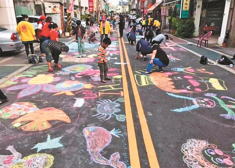 台中市梧棲區朝元宮去年十一月舉辦活動,將梧棲老街前封路,讓小朋友在大馬路上塗鴉,民眾塗得不亦樂乎;台中市勞工局在今年四月,也於光復新村青創基地舉辦地景彩繪活動,來自台中市各地愛好繪畫的國、高中生及小學生共同在馬路上飆創意。