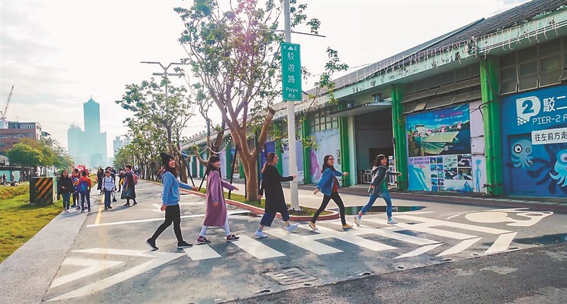 高雄駁二藝術特區「駁遊路」上的魚骨頭斑馬線,成拍照打卡熱點。