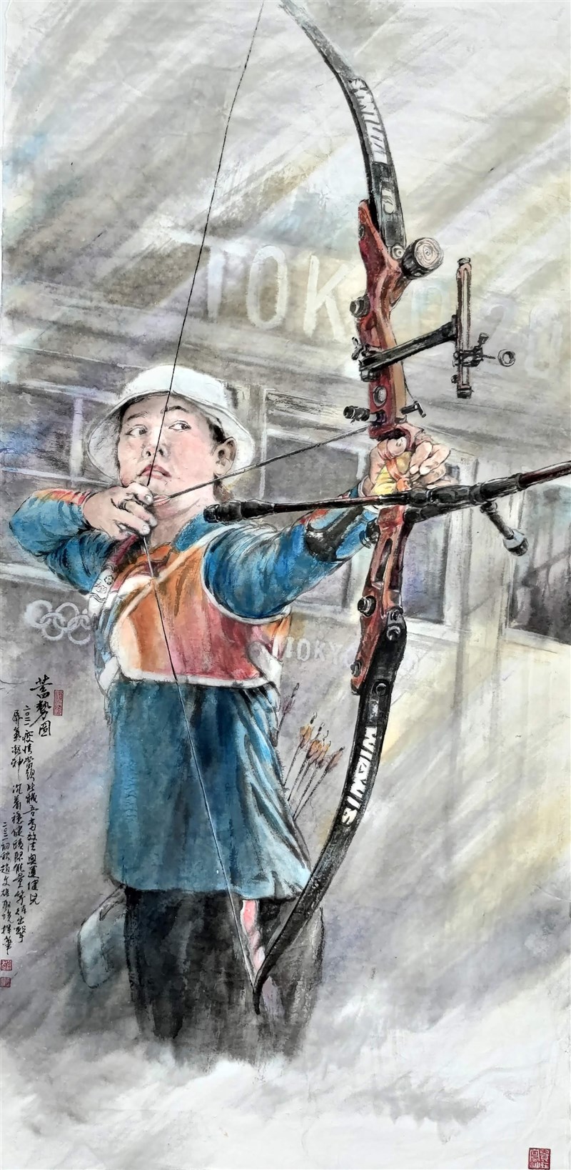 趙文雄《蓄勢圖》以彩墨繪出台灣奧運射箭選手英姿。圖/中正紀念堂提供