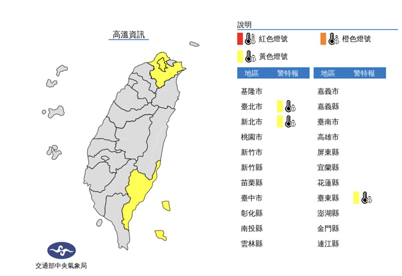 【本報台北訊】氣象局表示,天氣晴朗炎熱,今(14日)中午前後台北市、新北市及台東縣地區為黃色燈號,請注意。