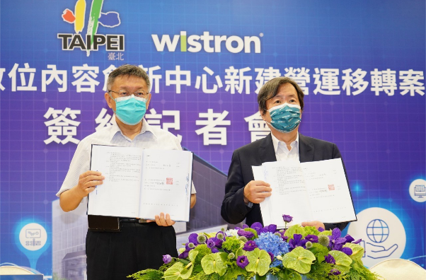 「台北市數位內容創新中心BOT案」今天舉行簽約典禮,柯文哲與緯創集團旗下的緯成資產管理股份有限公司董事長林福謙共同簽署投資契約。此BOT案基地廣達約2公頃,位於內湖行善路周邊,為內科及南港產業聚落的樞紐位置,未來將有捷運環狀線東環段通過。