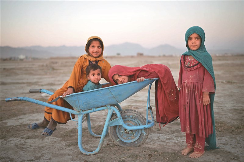 阿富汗許多家庭因為戰亂逃離家園,來到首都喀布爾避難,這些家庭的孩子13日在避難營裡頭玩耍,對記者擺姿勢拍照。圖/美聯社
