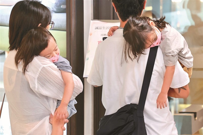 雙北疫情拉警報,民眾繃緊神經加強防護,幼兒外出在家長懷裡睡著,口罩仍戴緊緊一刻不鬆懈。圖/林俊良