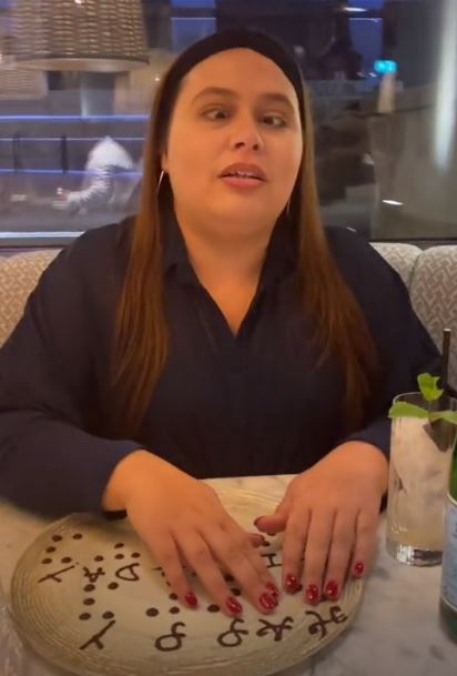 英國視障女性媞帕過生日,朋友請餐廳用巧克力寫成點字「生日快樂」,媞帕摸到點字版笑開懷。圖/取自tiktok@natbysight