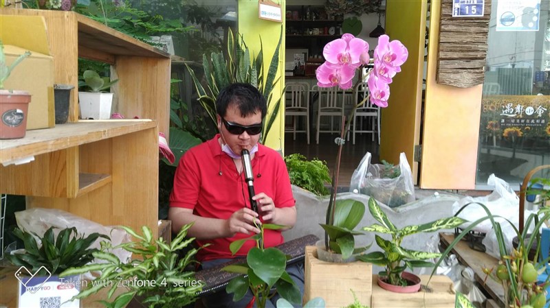 張友綸和媽媽是街頭藝人搭檔,一個表現花藝、一個演奏音樂,希望大家多買花,讓母子得以生活。圖/周大觀基金會提供