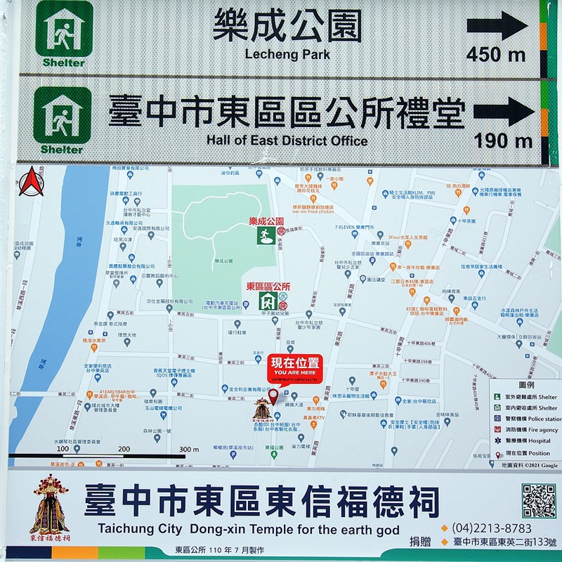 台中市東信福德祠發揮宗教公益精神、捐贈並認養「防災避難看板」。圖/東區區公所提供