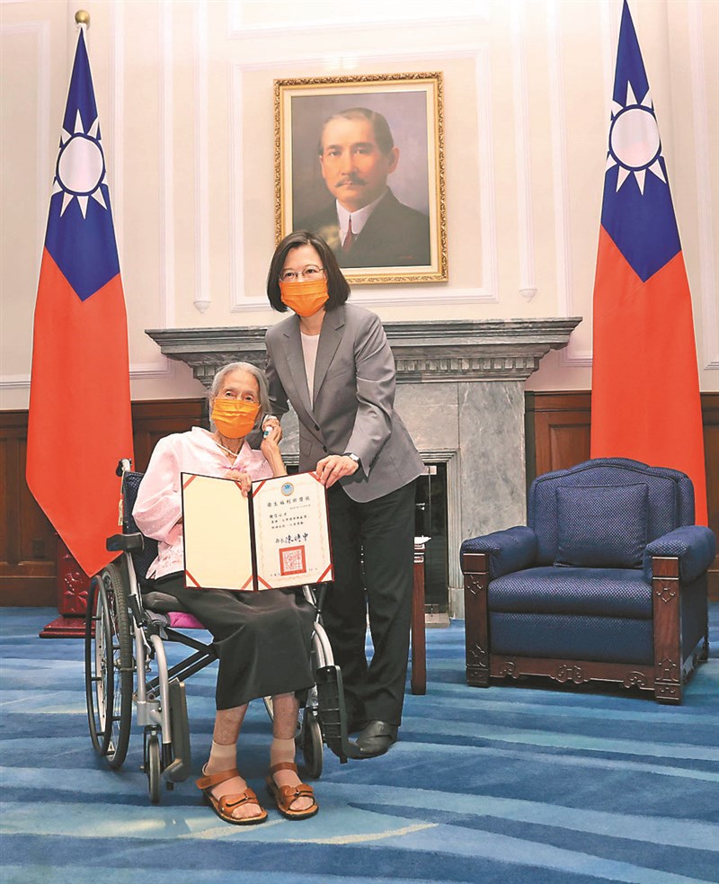 【本報台北訊】總統蔡英文昨天在總統府,頒獎給台灣護理典範獎得主鍾信心。總統說,鍾信心已在護理界服務八十年,「是我們的國寶」,不但樹立典範,更提攜許多後進,對此表達最深的敬意,並感謝全國護理師,在疫情期間的貢獻與犧牲,希望大家共同努力,讓護理界成為守護台灣最重要的力量。