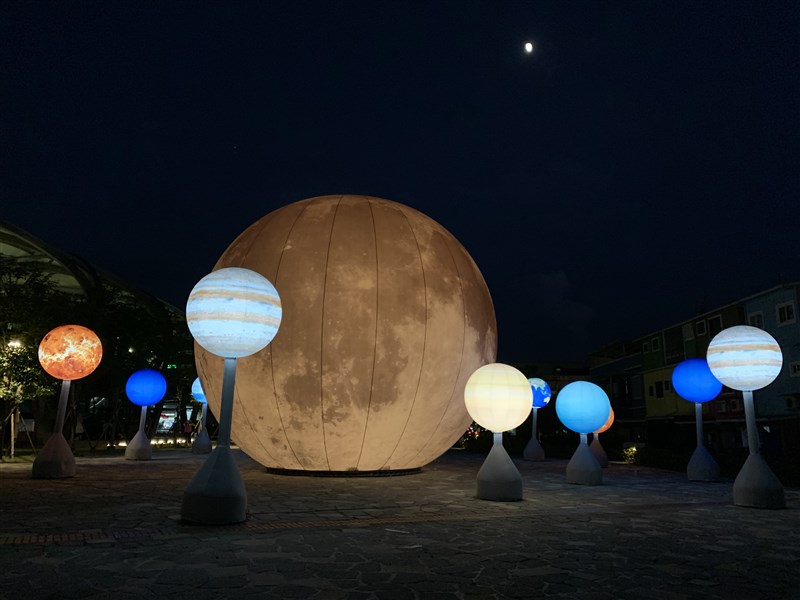 全國最大的3D立體月球旁,搭配12顆小行星,加上燈光投射,營造出不一樣的中秋節氛圍。圖╱林佳彣