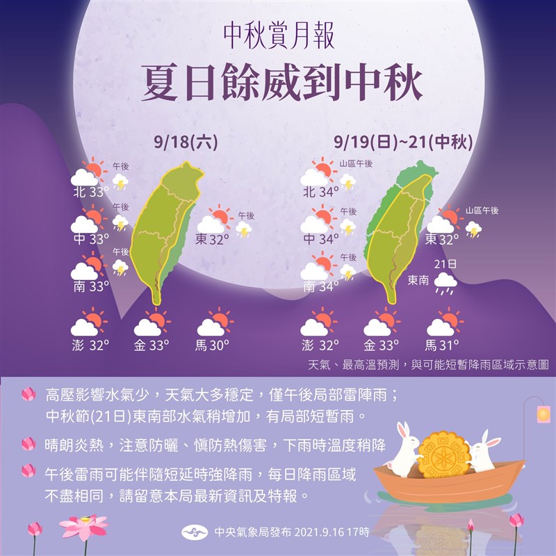 【本報台北訊】中秋連假將至,中央氣象局說,今明兩天水氣偏多,午後雷陣雨範圍廣,19日開始午後雷陣雨範圍縮小,不過到了21日、中秋節當天台灣附近水氣變多,東南部賞月機率比各地機率低些。
