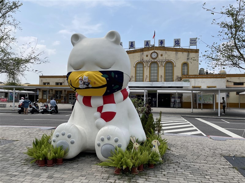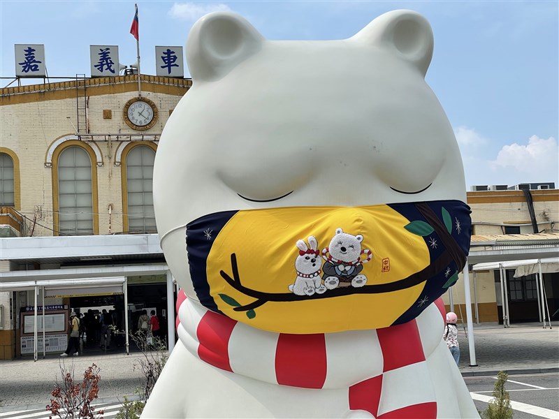 嘉義火車站前方廣場的地標「沉睡大白熊」,換上新的中秋節應景口罩。圖╱林伯驊