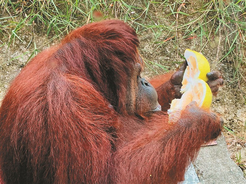 浣熊與馬來猴一拿到特製月餅都忍不住搶食,一口將嘴巴塞滿;紅毛猩猩「雄大」拿到柚子,就熟練俐落地剝去外皮享用,讓現場遊客驚呼連連太聰明。