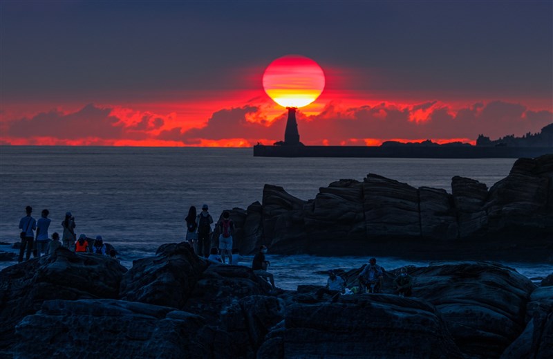 中秋節前後從基隆外木山海岸,可以看到太陽從基隆港嘴外堤燈塔後方升起,形成國門燈塔懸日美景。圖/張隆提供