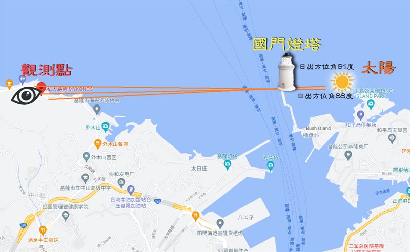 中秋節前後從基隆外木山海岸,可以看到太陽從基隆港嘴外堤燈塔後方升起的畫面。圖/取自張隆臉書基隆國門燈塔日出時間和方位如下: