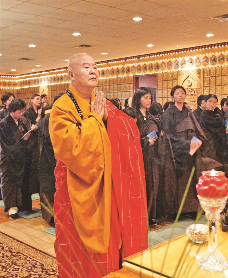 加拿大滿地可華嚴寺落成啟用,典禮當日大師為現場六百餘信眾,主持甘露灌頂三皈五戒典禮。 (2004.10.24)