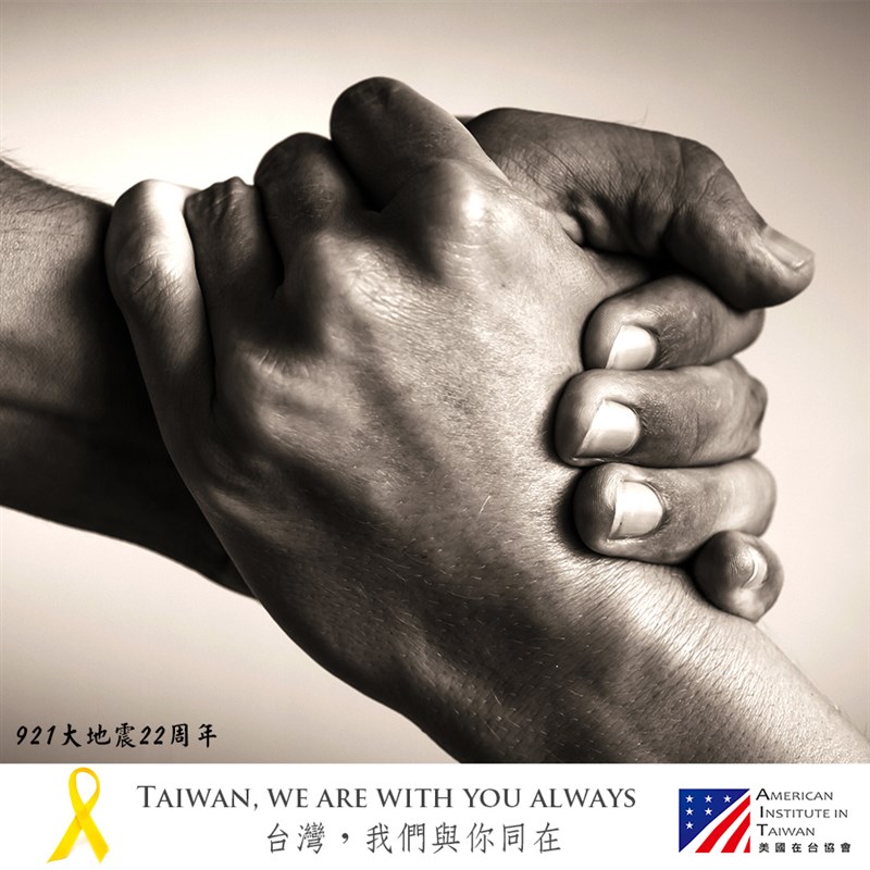 921大地震22周年,美國在台協會(AIT)也在臉書指出,台灣應變緊急情況的能力儼然已是印太地區備災的領導者,美國自豪能與台灣合作應對全球挑戰,並發布一張寫著「台灣,我們與你同在」的圖片。