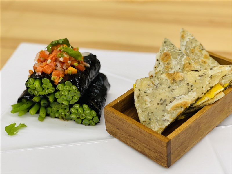 南投埔里蝴蝶餐特色料理「刺蔥煎餅與橄欖菜四季豆」。圖/新故鄉文教基金會提供