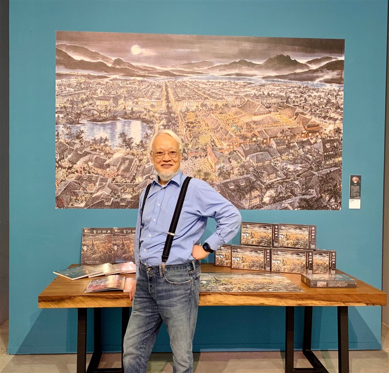 吳放表示,畫中可見龍山寺逢佳節的盛況,有的人在兜售、有的人在談天,看似細微的動作,卻蘊含滿滿的故事,畫作上方的月亮,無私又溫暖地照亮豐富多姿的人間眾生相,也投射出台北人早期生活樣貌。