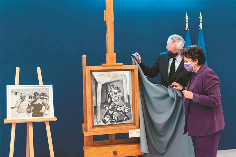 畢卡索女兒瑪雅向法國政府捐贈父親的作品抵免遺產稅,文化部長巴舍洛(右)公開其中一幅畫。圖/法新社