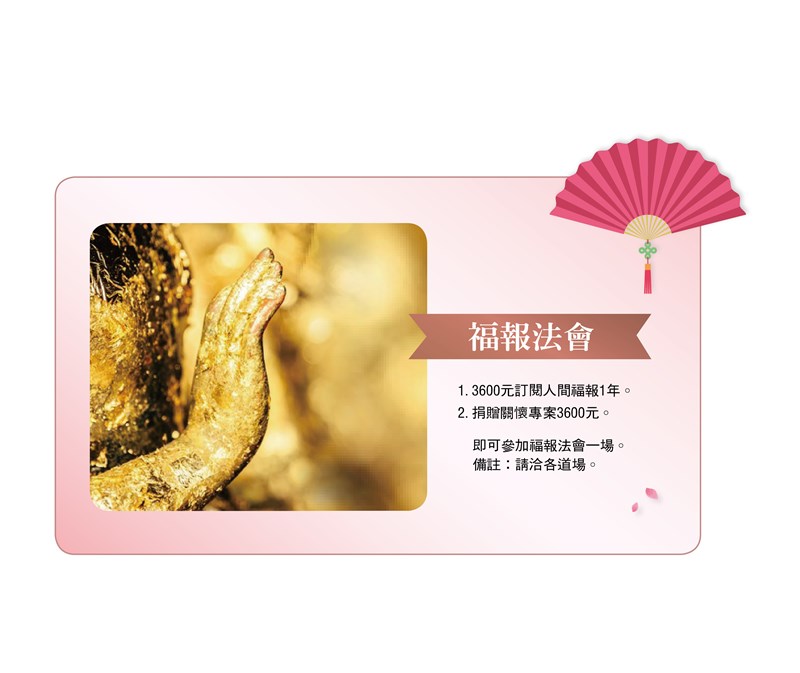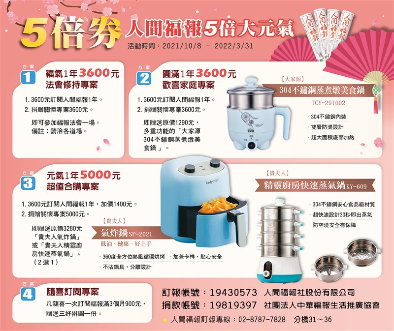 5倍券 人間福報訂報5倍大元氣 |2021.09.22 語音朗讀 76468觀看次 字級 大 中 小 圖/人間福報 人間福報響應5倍券推出5倍大元氣活動,自2021年10月8日至2022年3月31日起訂購人間福報享有5倍回饋,訂購一年可享法會修持專案或選擇歡喜家庭專案贈送原價1290元「大家源304不鏽鋼蒸煮燉美食鍋 」,超值合購專案可加價購「貴夫人氣炸鍋」或「貴夫人精靈廚房快速蒸氣鍋」二選一,詳細內容可電洽02-8787-7828 分機31~36,有專人服務說明。●方案1:福氣1年3600元法會修持專案1. 3600元訂閱人間福報1年。2. 捐贈關懷專案3600元。即可參加福報法會一場。備註:請洽各道場。福報法會修持專案。圖/人間福報。●方案2:圓滿1年3600元歡喜家庭專案1. 3600元訂閱人間福報1年。2. 捐贈關懷專案3600元。即贈送原價1290元,多重功能的「大家源304不鏽鋼蒸煮燉美食鍋 」。大家源304不鏽鋼蒸煮燉美食鍋 。圖/人間福報。贈品說明【大家源】304不鏽鋼蒸煮燉美食鍋TCY-291002.304不鏽鋼內裝 .雙層防燙設計.超大面積底部加熱●方案3:元氣1年5000元超值合購專案1. 3600元訂閱人間福報1年,加價1400元。2. 捐贈關懷專案5000元。即贈送原價3280元「貴夫人氣炸鍋」或「貴夫人精靈廚房快速蒸氣鍋」。(2選1)贈品說明【貴夫人】氣炸鍋SP-2021低油、健康、好上手.360度全方位熱風循環烘烤 .加蓋卡榫,貼心安全 .不沾鍋具,分離設計貴夫人氣炸鍋 。圖/人間福報。【貴夫人】精靈廚房快速蒸氣鍋KY-609.304不鏽鋼安心食品級材質.超快速設計30秒即出蒸氣.防空燒安全有保障貴夫人精靈廚房快速蒸氣鍋 。圖/人間福報。●方案4隨喜訂閱專案凡隨喜一次訂閱福報滿3個月900元,贈送三好拼圖一份。三好拼圖。圖/人間福報。◆訂報帳號:19430573人間福報社股份有限公司◆捐款帳號:19819397 社團法人中華福報生活推廣協會人間福報訂報/匯款專線02-8787-7828 分機31~36 前一篇文章 為產業興利 各部會提財經修正案 下一篇文章 美股3大指數回穩 台股受衝擊程度降低 熱門新聞 01全中運張雅佳游泳 3 金 雙破全國2026.04.2402【詩】 鐮刀俠2026.04.2103佛光山開山60周年 傳授三壇大戒2026.04.2004人情冷暖與計算 悅讀〈 杜十娘怒沉百寶箱 〉2026.04.2105【走讀城鄉】淡水市街清代三合院─施家古厝2026.04.24062026地球日 行動永續綠色未來 2026.04.2207永和學舍慶佛誕 千人浴佛清淨身心2026.04.2208嘉義.朴子 樸城煙霞古韻長 水道遺風話滄桑2026.04.2009火金姑復育有成 螢光爆發2026.04.2110衣服晾乾變硬 微觀祕密 2026.04.22 訂閱電子報 台北市 天氣預報 台灣一週天氣預報 相關報導 林佳龍任總統特使 抵史瓦帝尼看電影、聽演唱會 免課娛樂稅美太空人林琪兒 重返兒時舊居地第18屆兩湖論壇 南投登場總統訪史瓦帝尼 臨時喊卡陸惠台措施 商總:利民就該開放