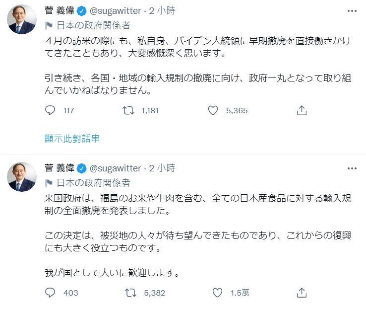 日本首相菅義偉在推特貼文,感謝美國全面撤銷對日本食品進口的限制。圖/翻攝菅義偉推特