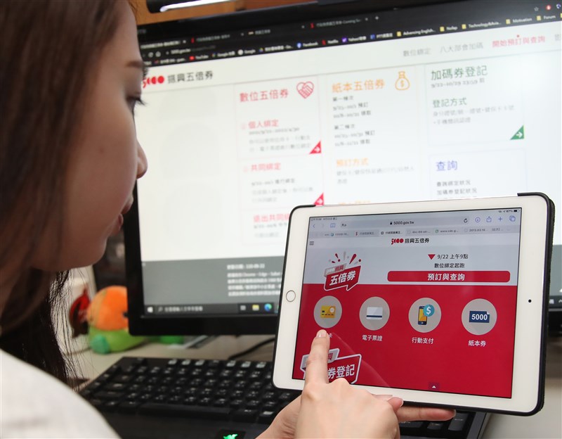 五倍券今開放數位綁定,截至中午,登入人次已逾350萬人,近64萬人完成綁定。圖/中央社