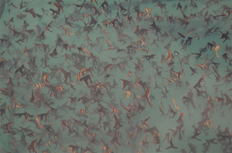 潛水人員放流尖翅燕魚苗後,成群魚苗悠游海中。圖/中央社