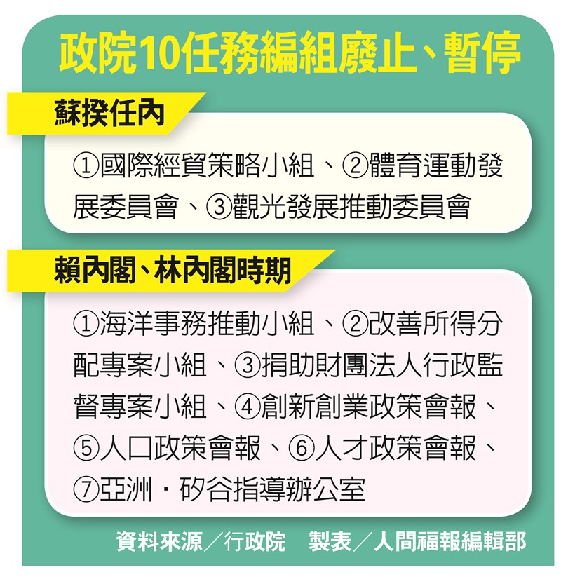 據了解,行政院底下,目前已廢止或暫停的十個任務編組中,在蘇揆任內廢止或暫停的,有國際經貿策略小組、體育運動發展委員會、觀光發展推動委員會。在賴內閣或林內閣時期廢止或暫停的,則為海洋事務推動小組、改善所得分配專案小組、捐助財團法人行政監督專案小組、創新創業政策會報、人口政策會報、人才政策會報、亞洲・矽谷指導辦公室。