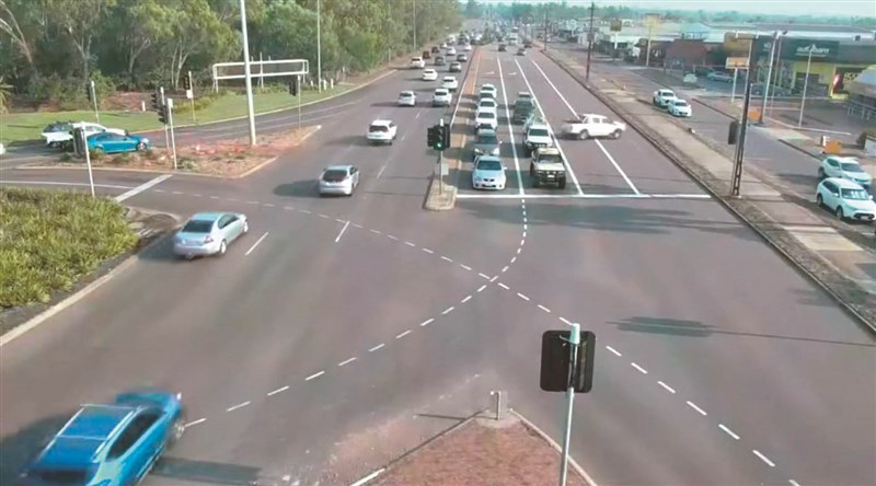 事發地點在澳洲北領地,一輛豐田Hilux皮卡先是在穿越三角形沙地分隔帶時差點撞上另一輛車,接著毫無減速地一口氣穿越車來車往的三線道,再穿越二個正在停等紅燈的靜止車道,最後又彈又跳地跨越二個無車車道,衝向路旁一排店面。