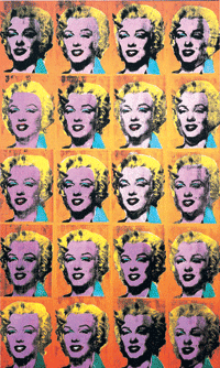 圖示「瑪麗蓮夢露」(二十次),即(二十刷),則為這種視覺經驗普普作品的代表。事實上,沃霍爾所構築的瑪麗蓮夢露偶像明星的背後,隱示著現代人的文明危機以及精神悲劇;他反覆重疊同一素材和主題,正意味著一種呆板無趣的現代人的生活經驗酖酖單調與無聊,「重覆」雖然是一種力量,但也是一種「貧乏」。